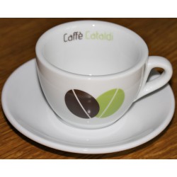 White porcelain cappuccino cup with Caffè Cataldi logo beans on the outside and "Caffè Cataldi" on the inside.